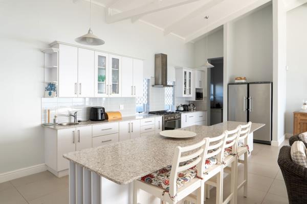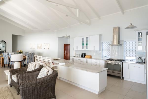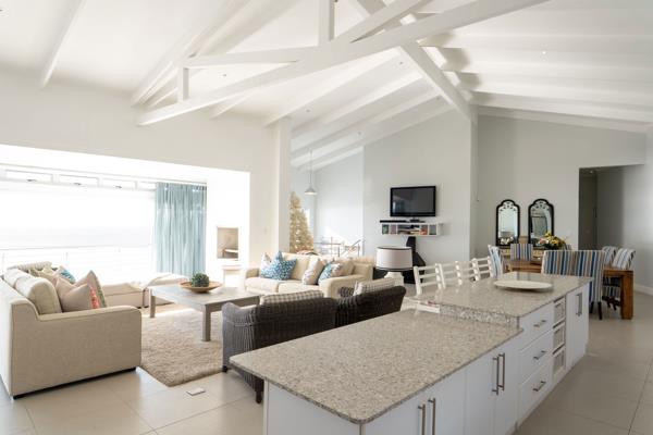 Enjoy cosy evenings by the fireplace, or step outside to the expansive wooden deck that offers the most breath taking sea views. The outdoor entertainment area includes a built-in braai, making it ideal for gatherings and sunset dinners by the ocean. The property also features a double automated garage and is secured with perimeter beams for peace of mind.