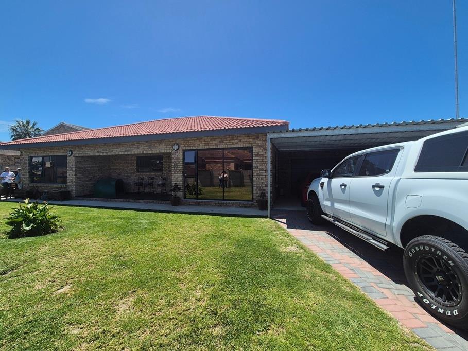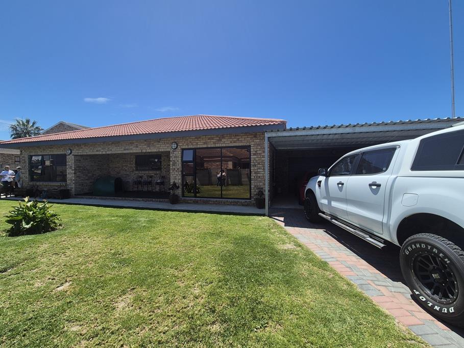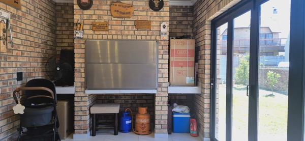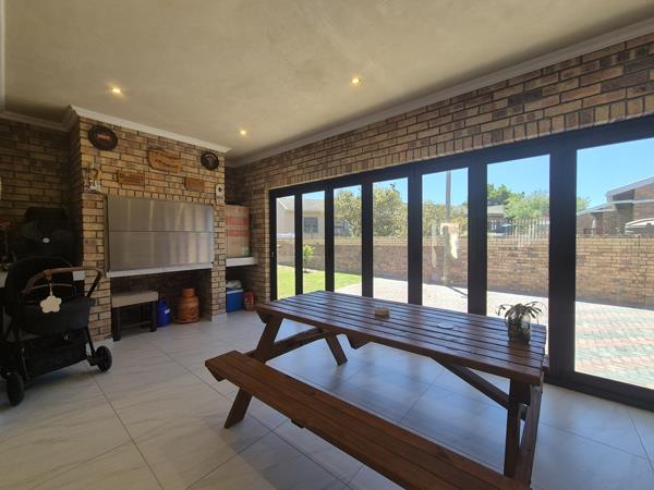 Step inside to a spacious open-plan living area with lounge, dining space, and braai room featuring a built-in braai and stacker doors opening to a private patio.