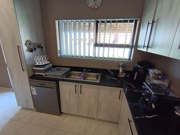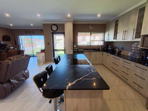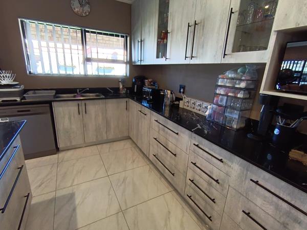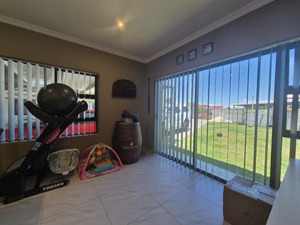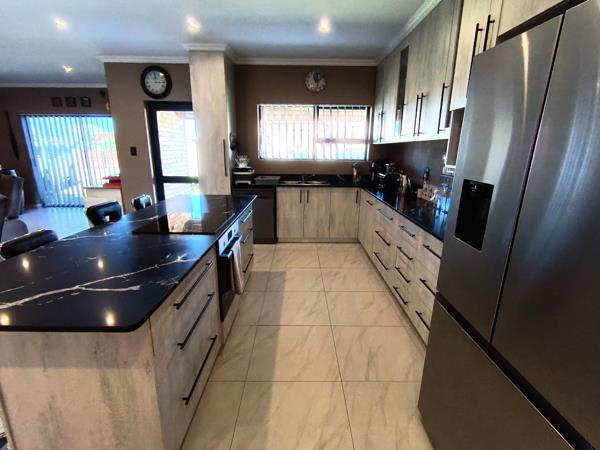 Down the passage, three generous bedrooms, each with elegant built-in cupboards and two well-appointed bathrooms including a main en-suite. Tiled floors, and fitted blinds throughout