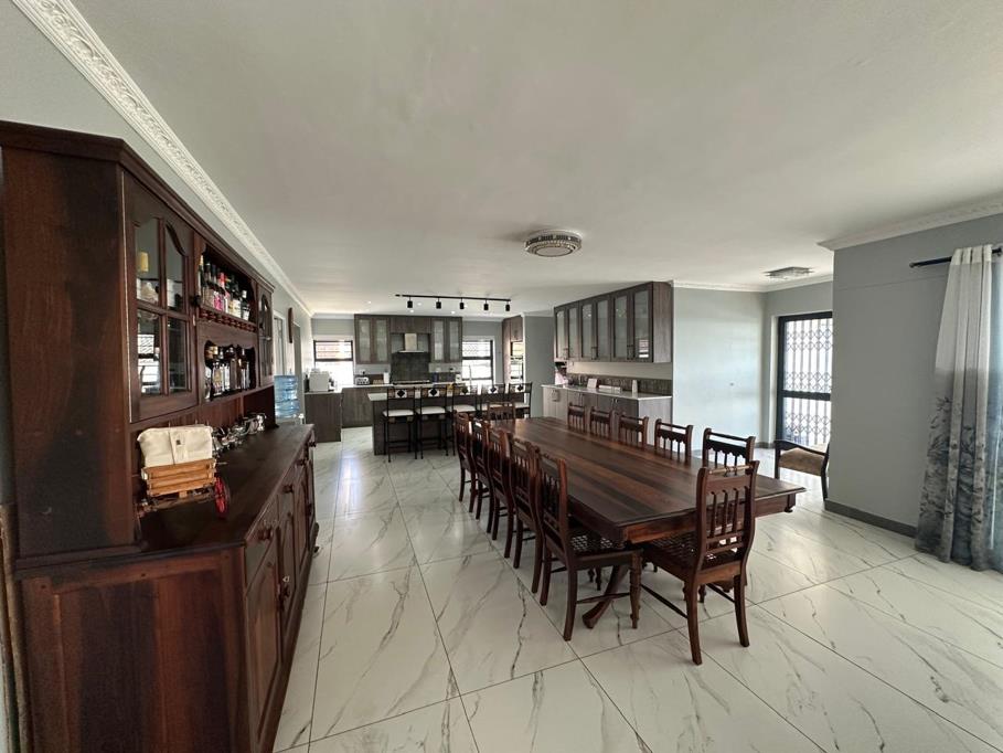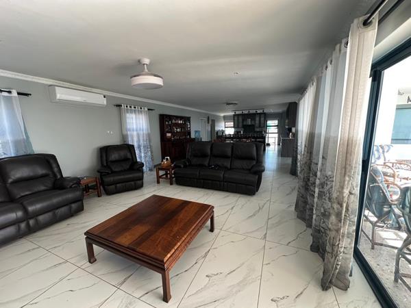 The expansive open-plan living, dining, and kitchen area offers ample space, complemented by a large scullery. A second lounge opens onto a covered braai area and the pool, framing beautiful mountain and ocean views.