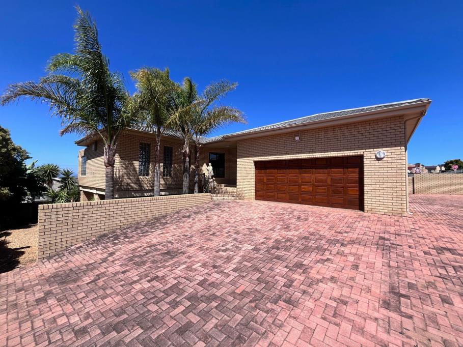 The kitchen flows seamlessly into a very spacious open-plan living and dining area, featuring beautiful sea views, a large built-in gas braai, and access to a sunny patio. The living area is also directly accessible from the front entrance, offering added convenience.