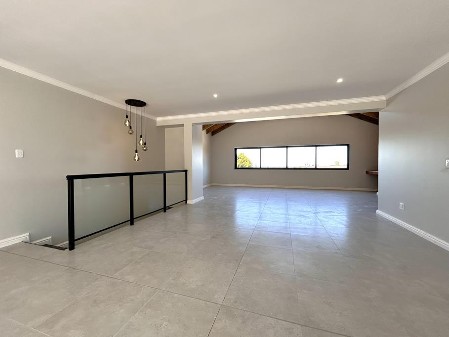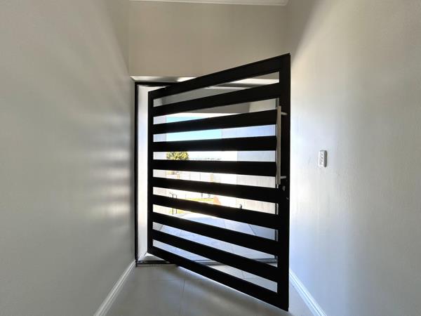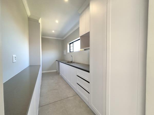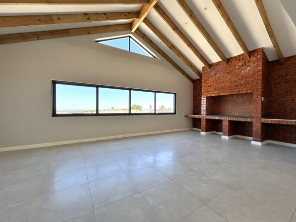 The home features a sleek, modern kitchen with a separate scullery, flowing seamlessly into an open-plan living and dining area. Enhancing the indoor-outdoor lifestyle, full-length glass sliding doors open from the lounge onto a 24m2 covered patio, complete with a built-in braaiperfect for relaxed evenings and entertaining guests. Additional sliding doors along the dining area lead to a second covered patio of 21m2 at the rear of the home.