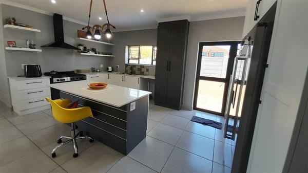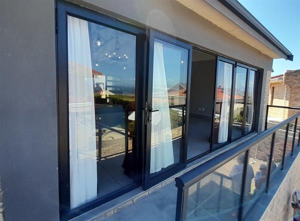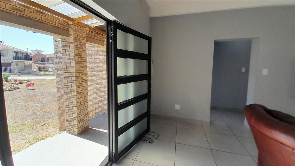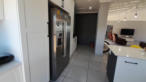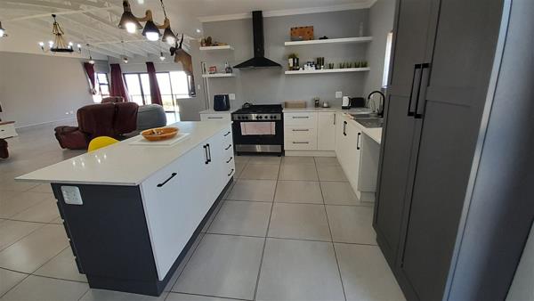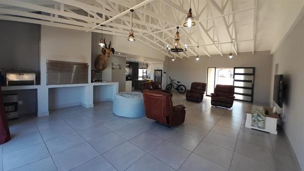 The big swivel glass front door opens in the spacious open plan living and dining area with the built is braai at the end of the room, where stacker doors open onto the balcony.