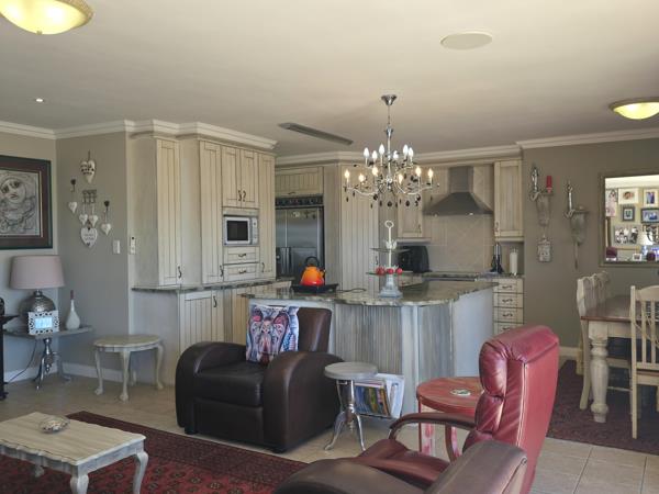 The TV lounge is truly special, embraced by incredible sea views that stretch across the ocean and over the mountains. Sliding doors open onto a balcony where you can enjoy unforgettable sunsets in the evenings. The dining area flows seamlessly from the lounge and forms part of a neat, modern kitchen, all with sea views, plus a separate scullery for added convenience.