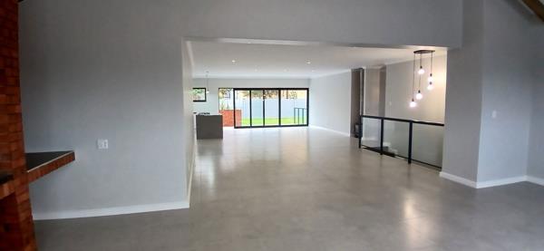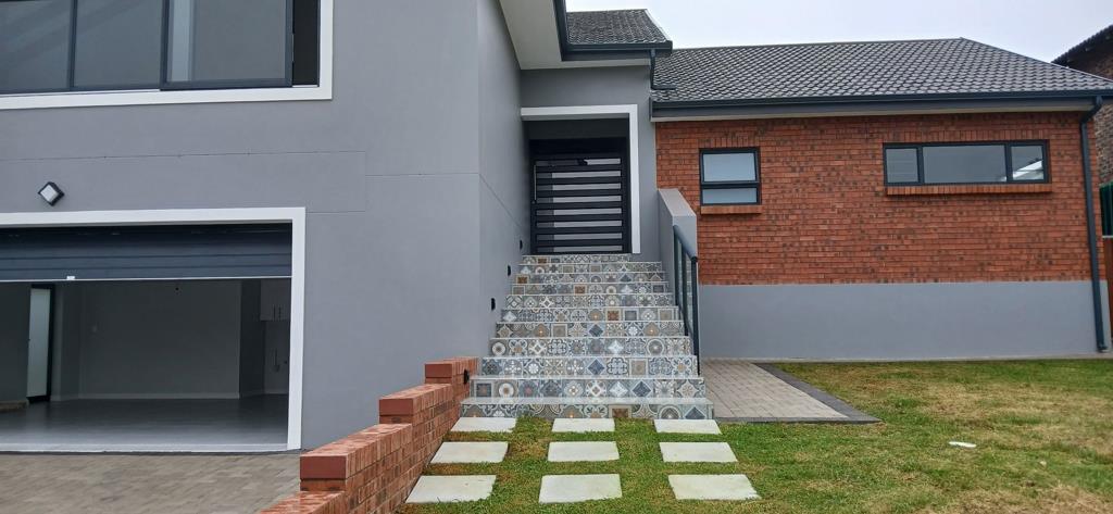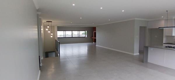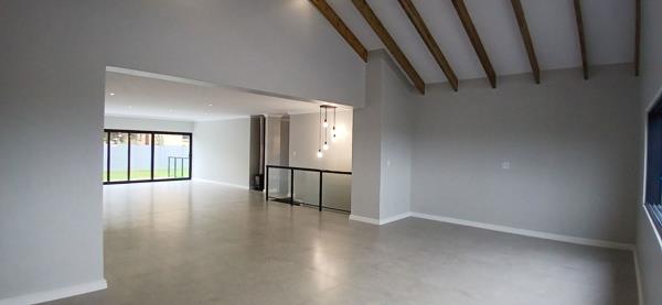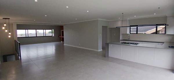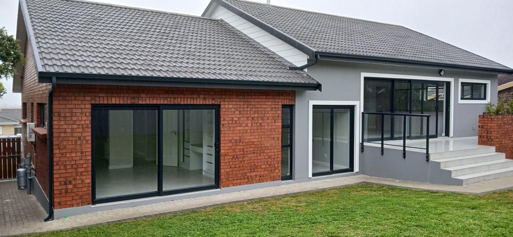 Beautifully Finished Family Home - Jefferys Bay. This modern, beautifully well-fitted home welcomes you with a wide and impressive entrance hall that flows seamlessly into an open-plan living, dining, kitchen, and braai area, complete with striking exposed beams that add warmth and character.