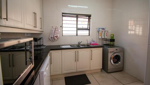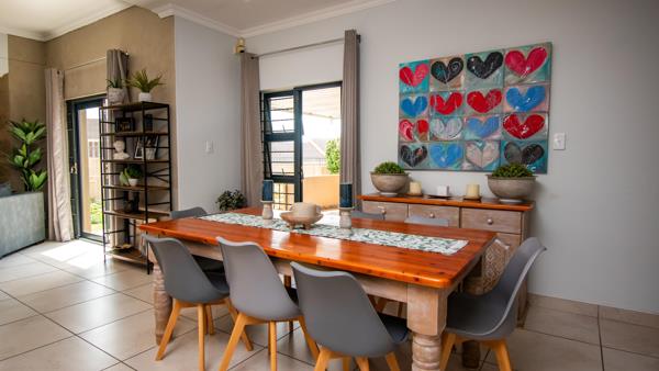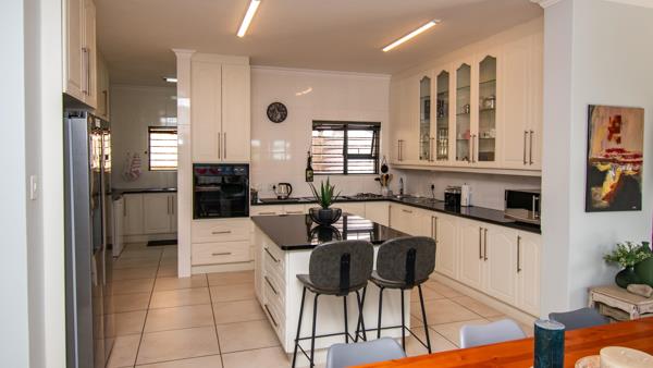The kitchen is generous with granite tops, lots of cupboards, an island, eye-level oven, ceramic hob plus gas plates, and space for a double-door fridge. The scullery is separate and tucked away, so the kitchen stays looking neat even when life is happening. The dining area flows straight off the kitchen, so cooking and chatting with family or friends happens naturally.