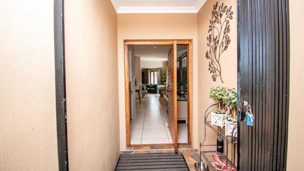 You drive in through automated gates and straight away it feels peacefullush planting, neat paving, and the sound of a little water feature in the front garden. Step inside and the entrance is bright and airy with a double-volume staircase with a statement chandelier.