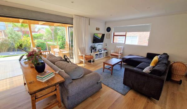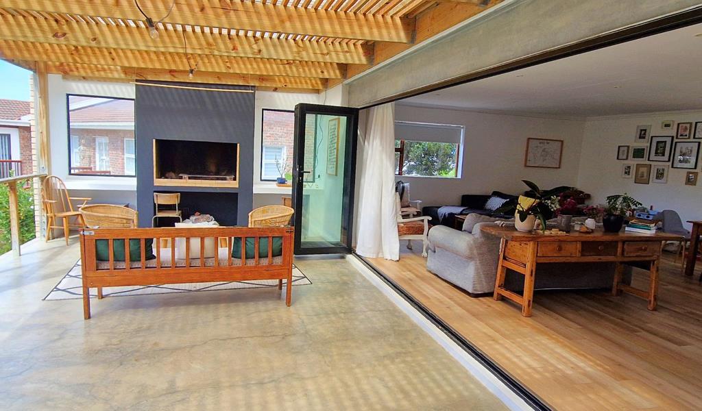 The home welcomes you with a spacious open-plan living area designed for seamless indooroutdoor living. Custom bifolding doors open onto a large covered patio with a built-in braai, creating the perfect entertainment space while overlooking a lush garden with established trees and plants.