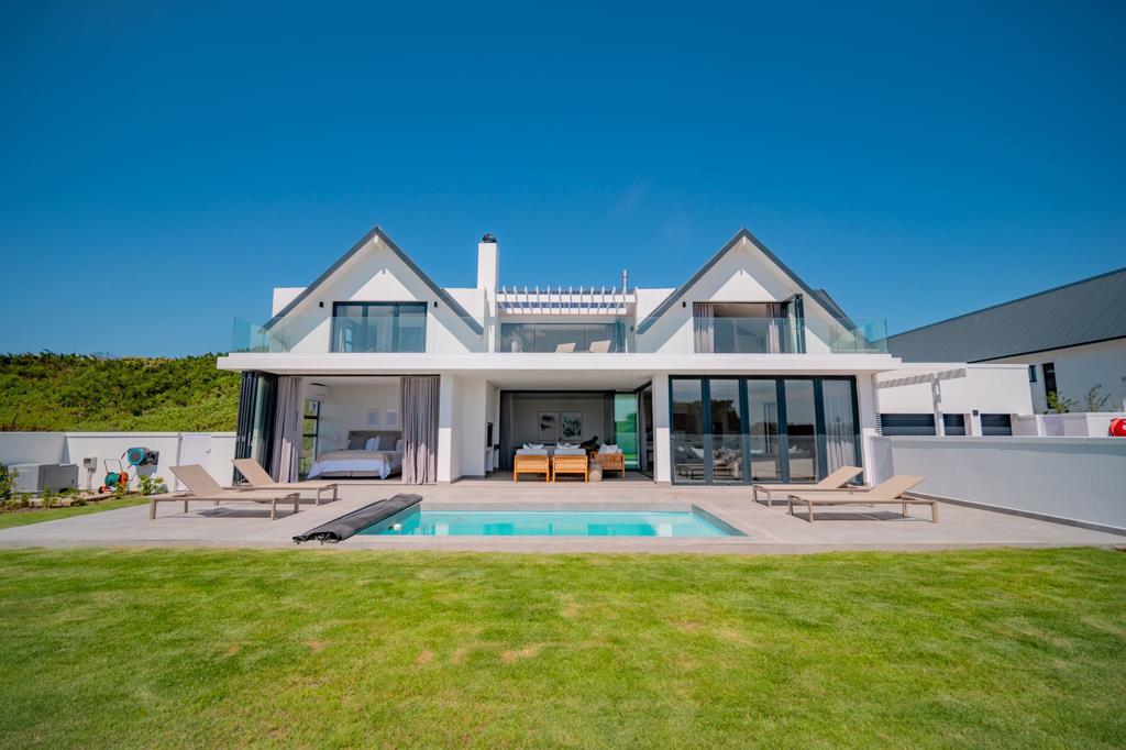 There are two east-facing bedrooms that have sliding doors out onto the garden. They are well protected from the prevailing winds and gets lots of lovely light. One bedroom is north-facing with sliding doors onto the patio and garden on the pool side. The one south-facing bedroom opens onto the private back garden, with a view of the beautiful natural dune ridge. The large bedrooms are luxurious, with air conditioning and underfloor heating in the bathrooms. A guest loo is conveniently situated in the passage.