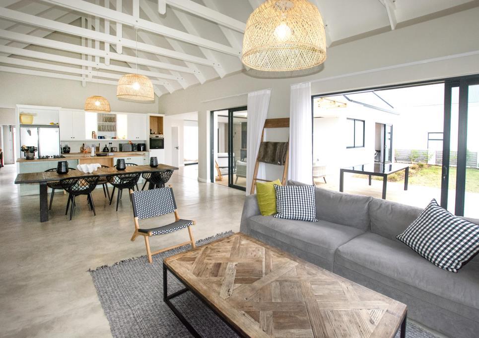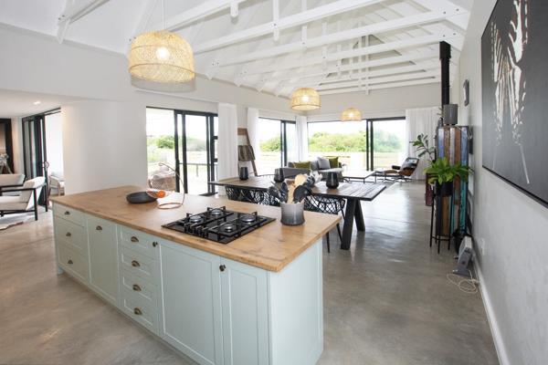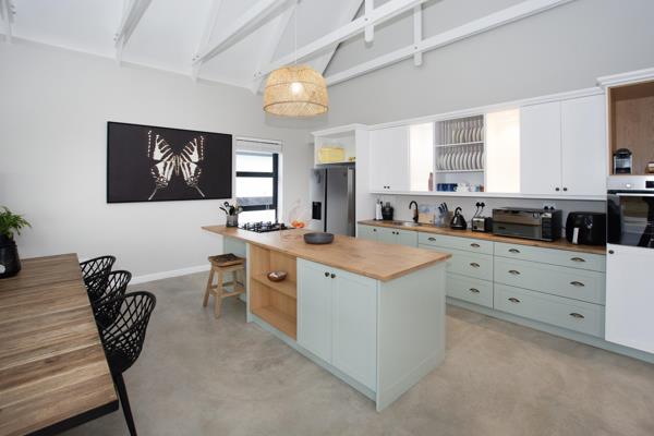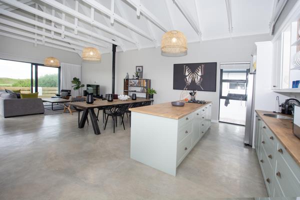 The open-plan design of the home is highlighted by a central island in the kitchen, which provides generous space for cooking and casual dining. This layout seamlessly integrates the kitchen, living, and dining areas, fostering an environment that promotes inclusive entertaining and effortless living.