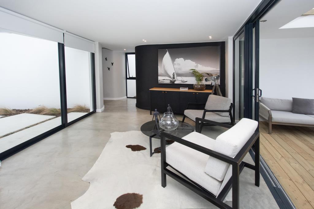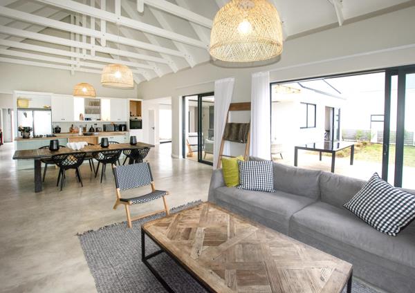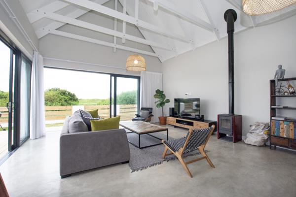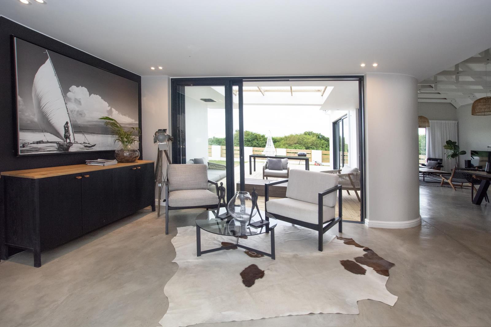 The expansive living room, adorned with chic contemporary details, offers a warm and inviting atmosphere perfect for both relaxation and entertaining. This space opens directly onto a charming deck, featuring a built-in braai (barbecue) and providing breathtaking views of the far end of the driving range. The deck extends your living area outdoors, making it an ideal spot for hosting gatherings or simply enjoying quiet moments.