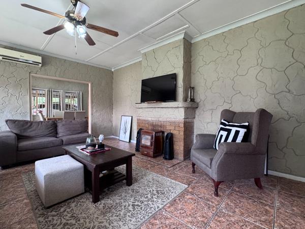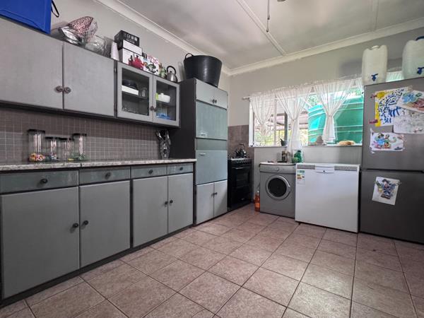 The main house features a dining area, a TV room fitted with air conditioning and an anthracite stove, and a comfortable lounge that leads out to a covered patio, perfect for relaxed outdoor living. The kitchen is practical and well laid out, and the home offers three bedrooms with built-in cupboards. A full bathroom and a separate toilet add to the convenience. Additional features include a storeroom, a swimming pool, a Wendy house, and a JoJo tank for rainwater harvesting. Parking is well catered for with a carport that can accommodate four vehicles.