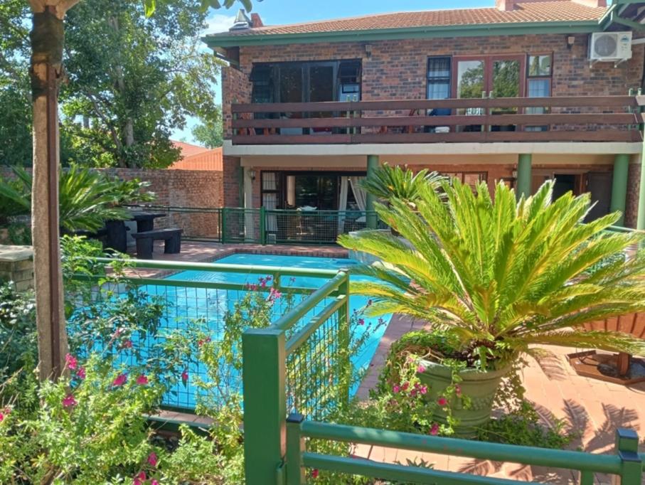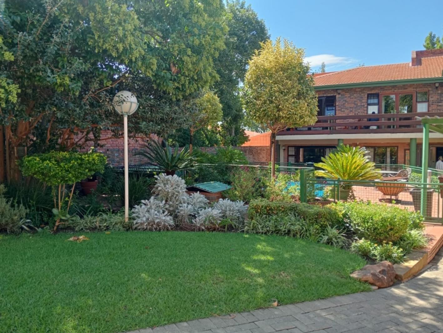 The outdoor area offers a tranquil, landscaped garden with a swimming pool and automated irrigation system. Additional features include a storeroom, a water storage tank for backup supply, and a domestic room with toilet facilities.