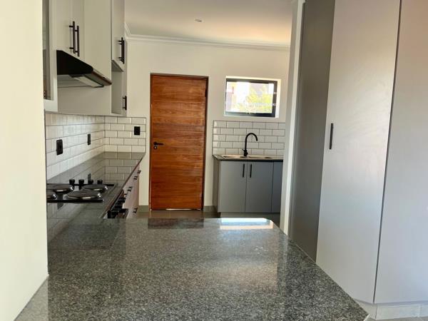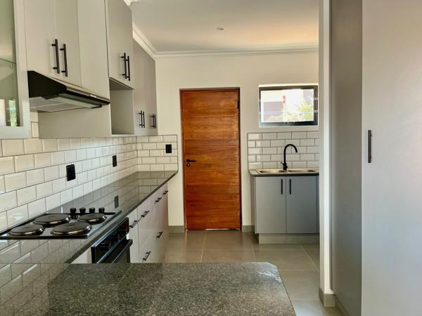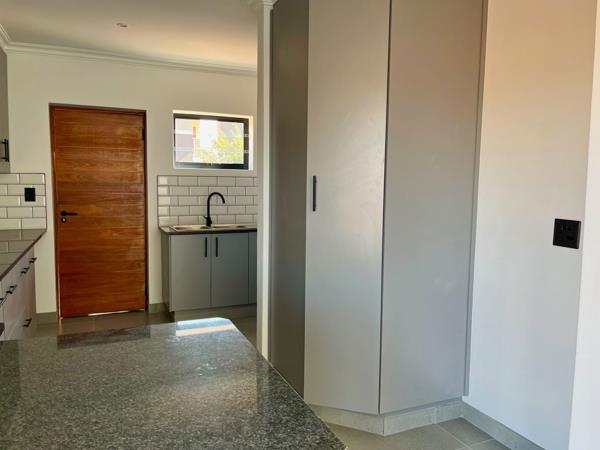 Modern kitchen with granite tops, modern cupboards, a separate scullery, and connections for a washing machine, dishwasher, and double door fridge with a water connection.
