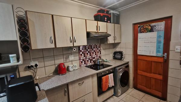 This Unit greets you with a spacious open-plan living room area that enters the kitchen with ample built-in cupboards and a built-in stove and hob. Tiled floors in the living area and kitchen.