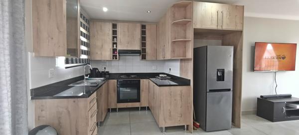 The modern kitchen is equipped with ample cupboard space, perfect for storage and culinary needs. All three spacious bedrooms feature built-in cupboards, while the main bedroom includes a stylish en-suite bathroom. A second full bathroom serves the remaining bedrooms.