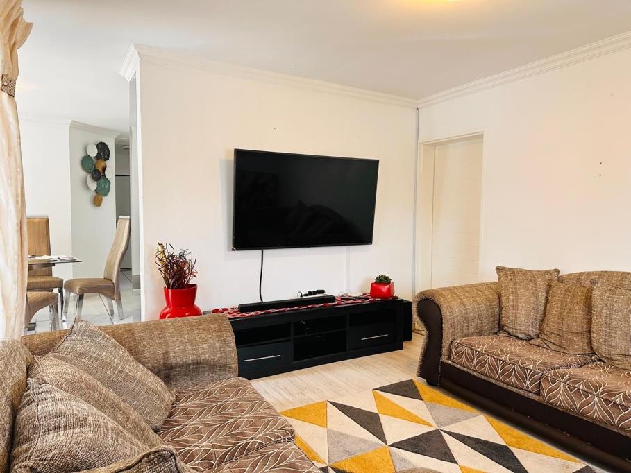 The spacious living area flows seamlessly into an open-plan dining space and a fully equipped kitchen, complete with glossy built-in cupboards that add a sleek, modern touch. All three bedrooms are fitted with laminated flooring and built-in cupboards, ensuring both style and practicality. The main bedroom includes an elegant en-suite bathroom, while a second full bathroom services the rest of the home.