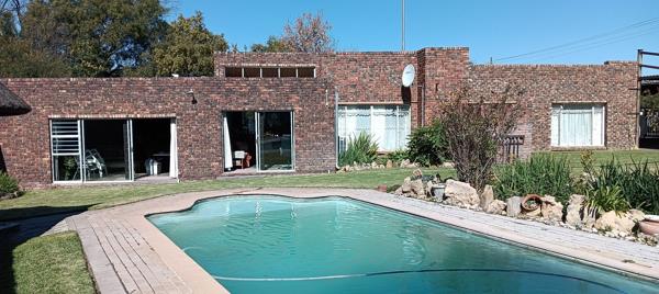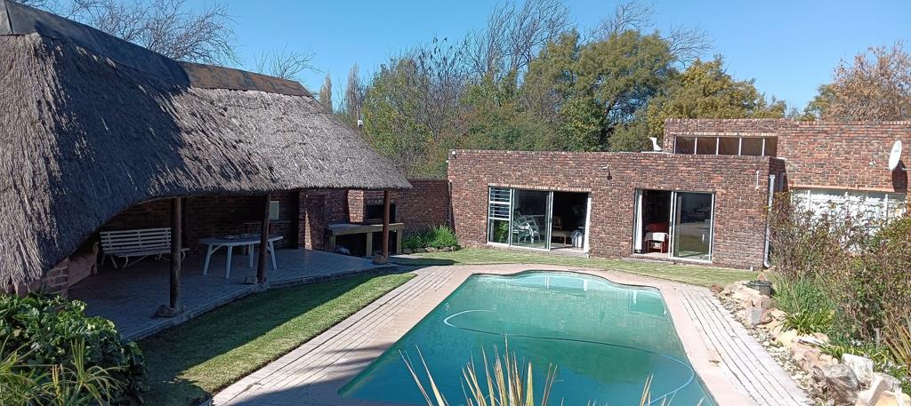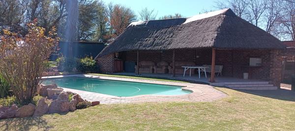 Outside, you''ll find a large courtyard with a stunning swimming pool, built-in-braai and thatched roof Lapa, ideal for those sunny days. The bar room, complete with a fireplace, offers a perfect retreat for relaxation. Additional features include an outside toilet and a water tank with a pressure pump, making this property truly versatile.