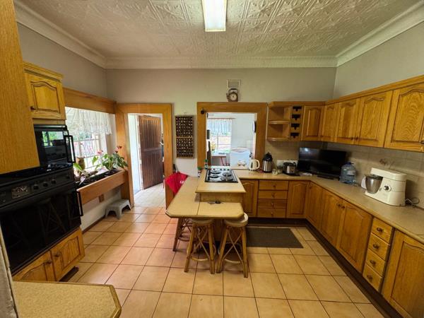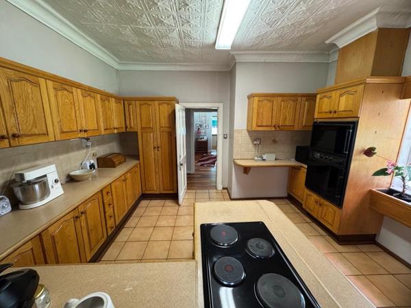 The kitchen is well-equipped with built-in cupboards, tiled floors, an eye-level oven, hob, separate scullery, pantry, and a dishwasher connection, ensuring convenience and practicality.