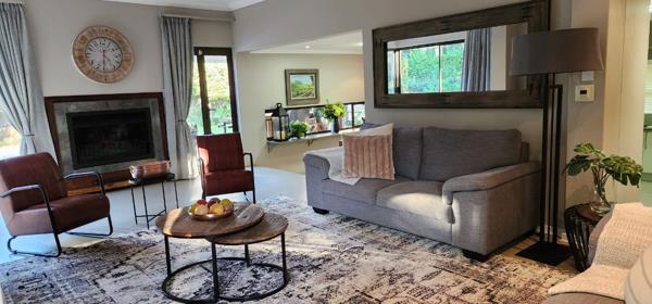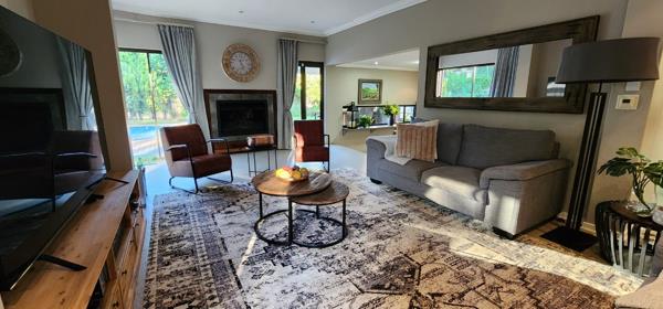 As you enter through the gated entrance, youre greeted by a paved driveway leading to a spacious double garage. Crossing the charming koi pond sets the stage for a serene welcome as you approach the double-sided glass front door and step into the beautiful entrance hall, where you will be blown away by the sight of the open plan living areas, which features a cozy fireplace and expansive picture windows that offer stunning views of the pool and lush backdrop of ripe orange trees. The beautiful white kitchen with a large centre island includes a gas stove and separate scullery, where connections for your kitchen appliances are found.