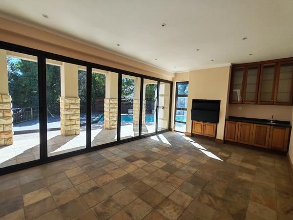 - braai room with built-in braai and stacking doors to sparkling pool and deck