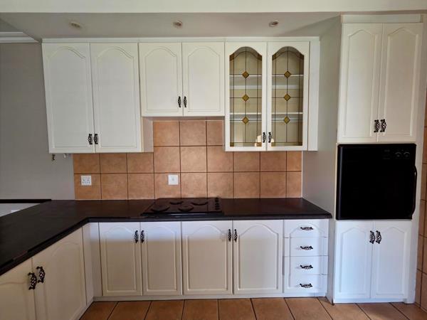 The open-plan living and dining area is light, airy, and flows seamlessly into the well-equipped kitchen. The kitchen offers a hob, eye-level oven, ample cupboard space, and a pantry, with seperate space for a double-door fridge. A separate scullery with fittings for all your appliances provides additional practicality.