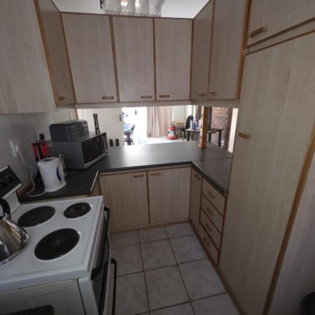 The home features a lounge with sliding doors leading to a private garden, a neat kitchen with plenty of cupboards and a stove, and two tiled bedrooms with built-in cupboards. A full bathroom includes a bath, shower, basin, and toilet.