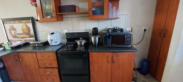 Two-bedroom apartment featuring built-in cupboards, one bathroom, an open-plan kitchen with cupboards, under-counter oven, and hob.