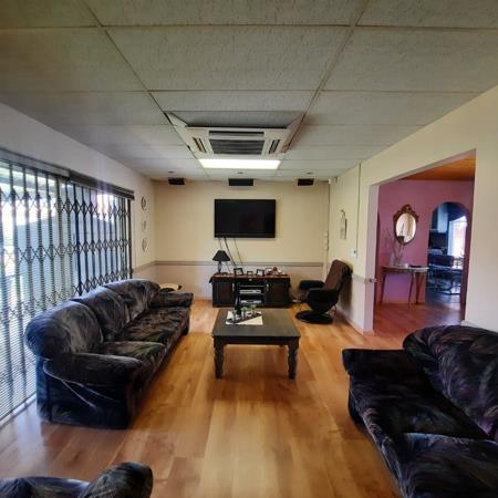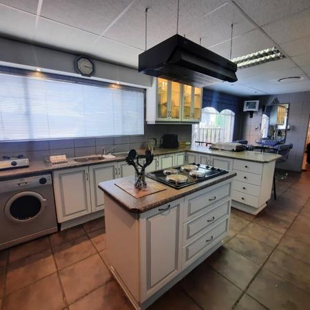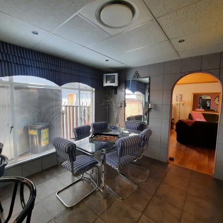 The immaculate kitchen boasts sleek white cabinetry that harmonizes wonderfully with rich brown tiles, showcasing unique built-in cupboards. The expansive TVfamily room and living room are designed with fitted laminated flooring, creating an open and airy atmosphere.