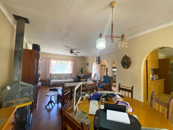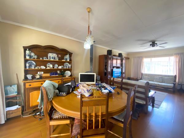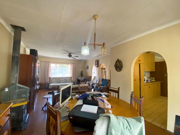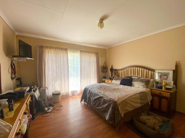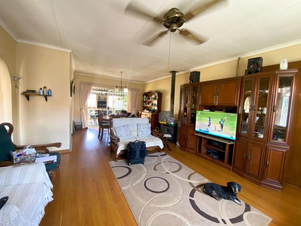 The living areas are warm and inviting, with a very spacious lounge that flows seamlessly into a cozy dining room area. A built-in fireplace adds character and creates the perfect atmosphere for cold winter evenings. The kitchen offers ample cupboard space and connects to a separate scullery, keeping the main kitchen neat and functional.