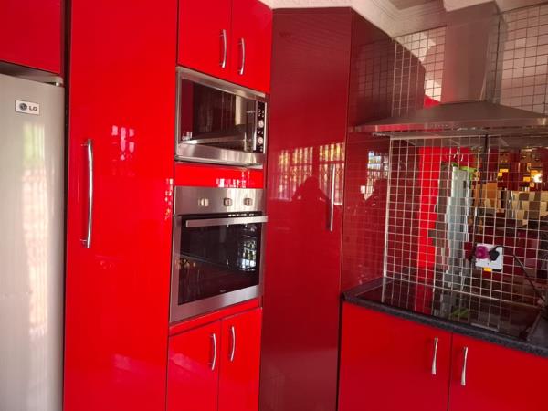 For the cook this colorful kitchen with hob, eye level oven, extractor fan, space for a double fridge, ample built-in cupboards and enough working surfaces, this is a dream come true.