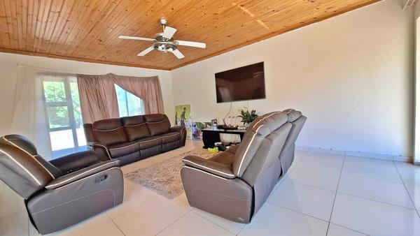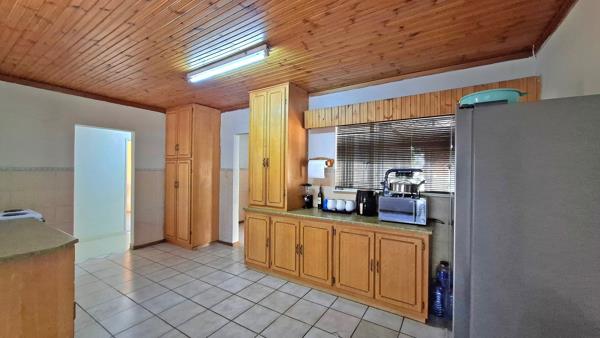 The open plan living and dining area flows seamlessly through sliding doors to the garden, creating an ideal indoor-outdoor lifestyle. The spacious kitchen includes ample cupboard space and a separate scullery, perfect for everyday convenience.