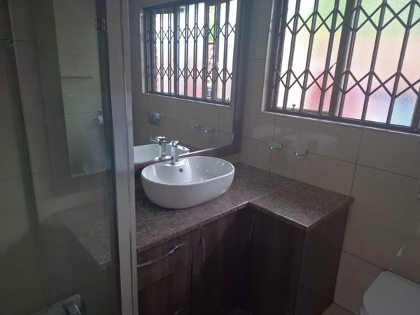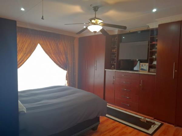 The main bedroom is spacious and the en-suite bathroom is modern with shower, toilet, basin, a mounted mirror and a fitted heater for the cold Bloemfontein winters.