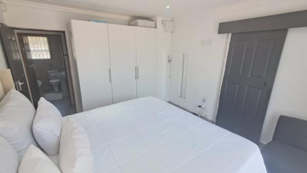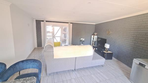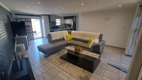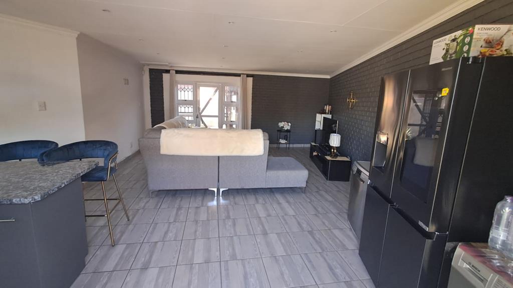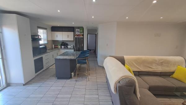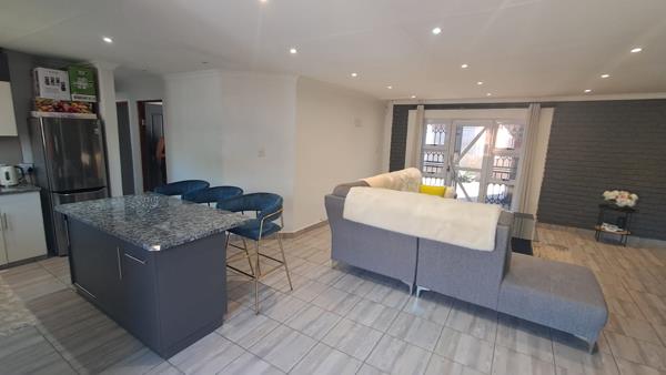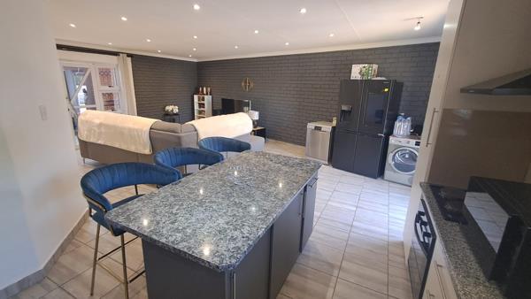 Dining & Lounge Areas Flowing seamlessly from the kitchen, the dining area opens through sliding doors to the braai area, ideal for weekend entertaining. The cozy lounge also features sliding doors, creating an inviting indoor-outdoor lifestyle. Both areas include security gates and are beautifully illuminated by modern downlights.