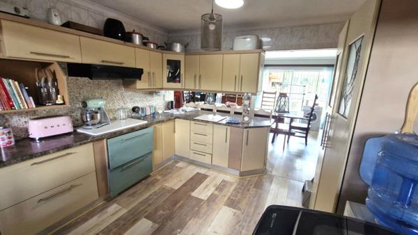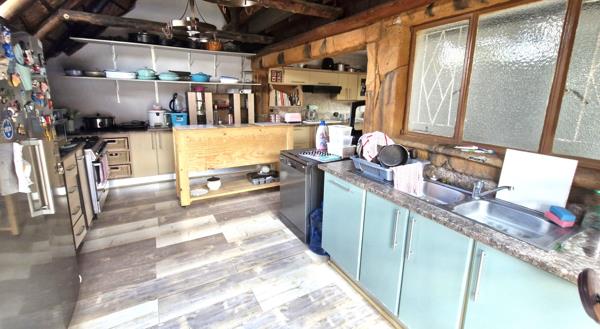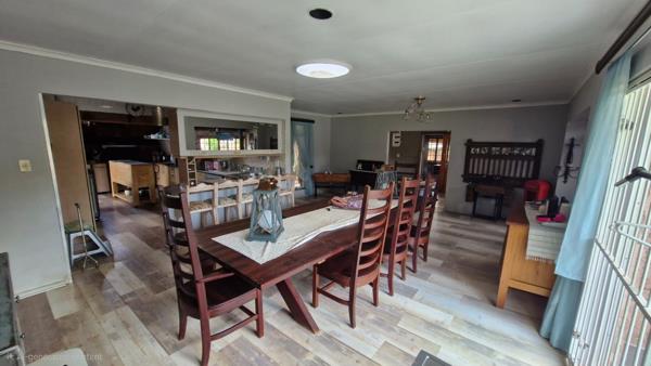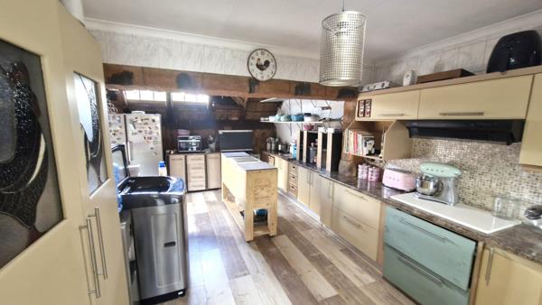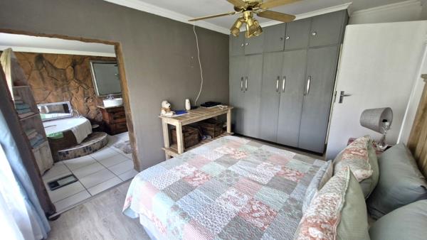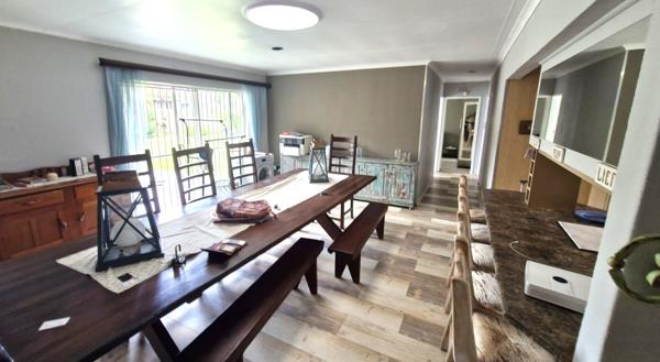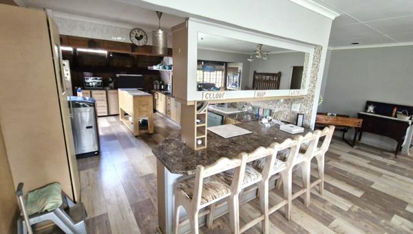 The open-plan kitchen, fitted with ample cupboard space and a separate scullery, flows seamlessly into the dining area and lounge. A built-in fireplace adds warmth and charm for those cold winter days.