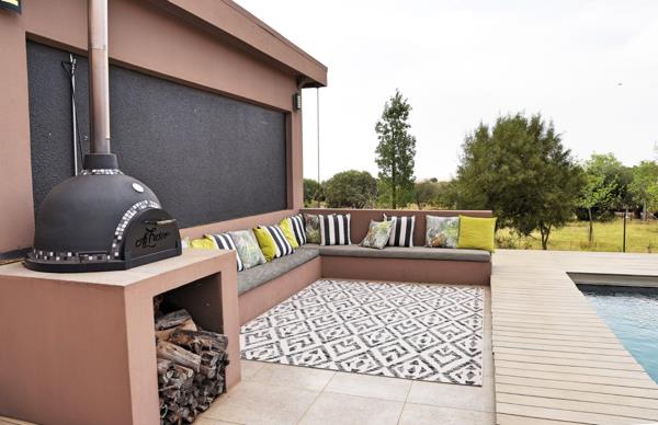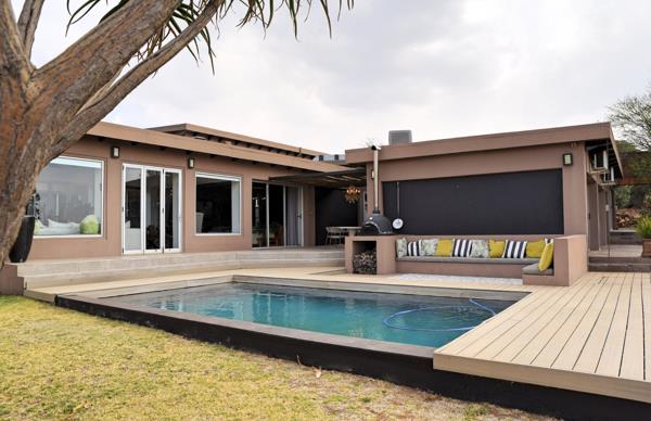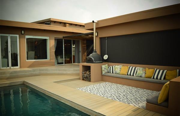 IndoorOutdoor Flow: Large glass doors connect living areas to a pool, covered stoep, built-in braai, pizza oven, and wooden deck perfect for entertaining and family gatherings.