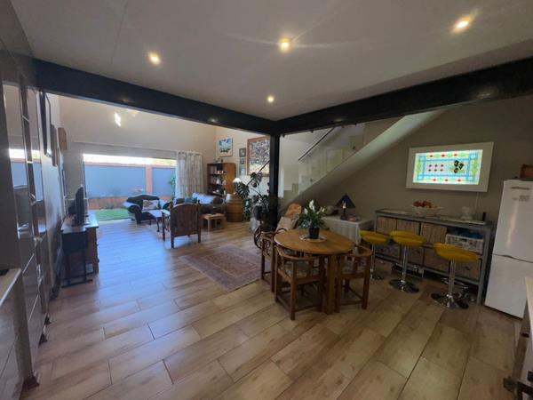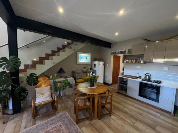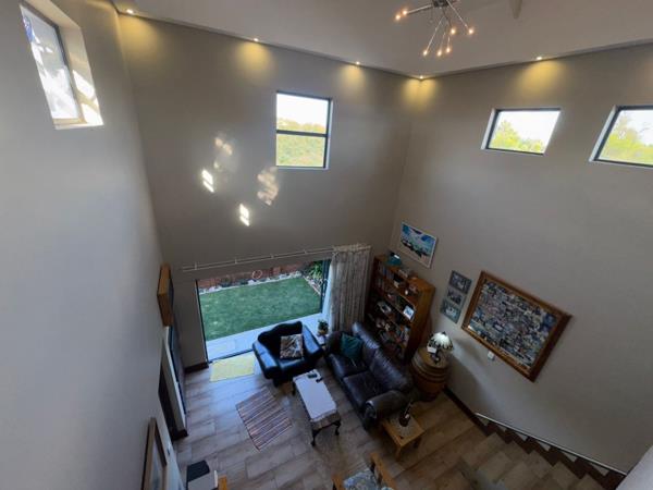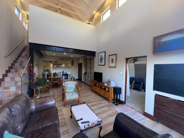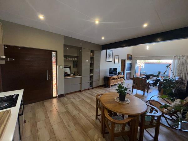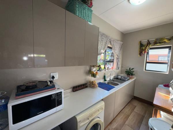 The home features a spacious open-plan living area that flows seamlessly into a modern kitchen fitted with a gas stove, ideal for easy everyday living and entertaining. Sliding doors lead out to a private balcony with louvre roofing, complete with a built-in braai and beautiful open views over the nearby field the perfect spot to unwind.