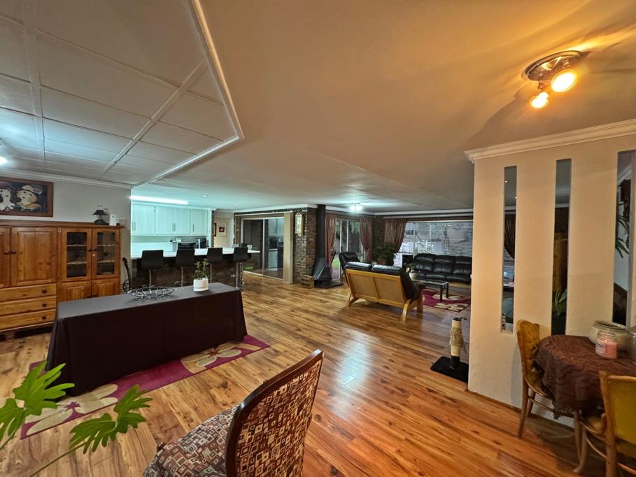The heart of this home lies in its expansive open-plan design, seamlessly integrating two living rooms with a spacious kitchen that flows into a large dining room, combining with a cozy TV room. The living spaces are complete with a charming fireplace, enhancing the overall ambiance.