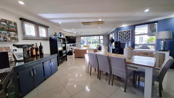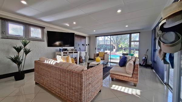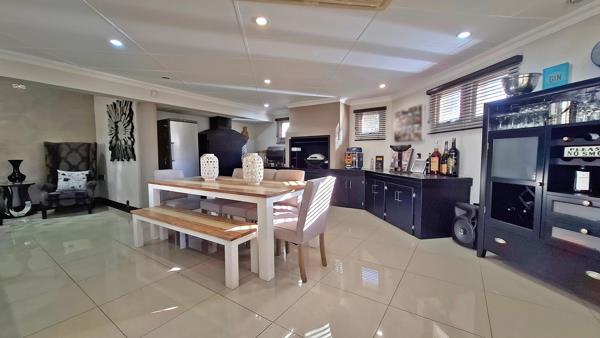 A true standout feature is the huge entertainment area with a built-in braai, opening via sliding doors to the patio and sparkling swimming pool, creating the ultimate indoor-outdoor lifestyle experience.