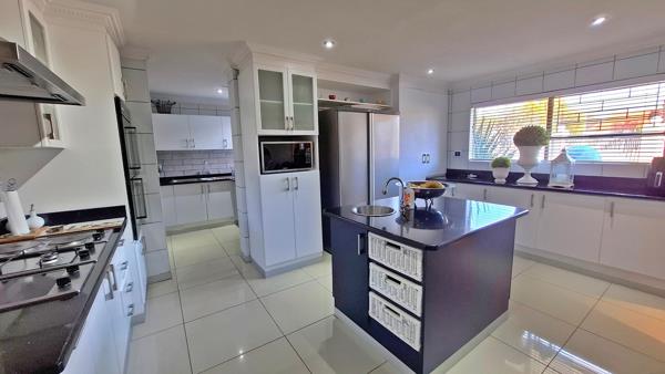 The modern kitchen is a chefs delight, boasting granite countertops, electric and gas hobs, a double eye-level oven, pantry, and separate scullery.