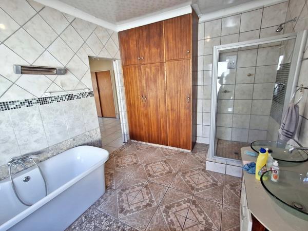 The home boasts generous living areas designed for both relaxation and entertainment. The open-plan kitchen includes a cozy breakfast nook and is complemented by a separate scullery with washing machine and dishwasher connections for added convenience.