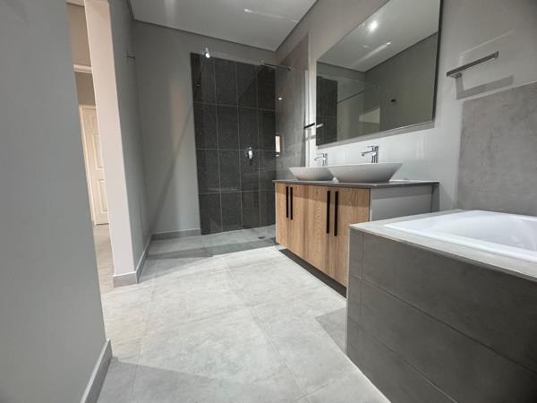 There are two tiled bedrooms with built-in cupboards, offering comfort and ample storage. The main bedroom includes a luxurious en-suite bathroom with a full layoutshower, bath, toilet, and double basin, all finished in contemporary tile. The second bathroom is also tiled and features a shower, toilet, and basin, ideal for guests or family.