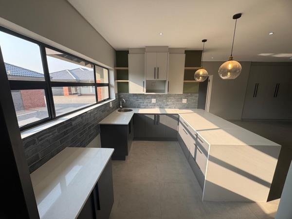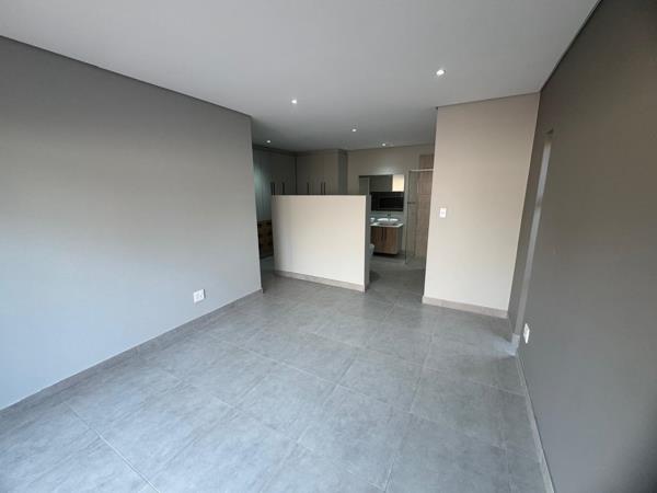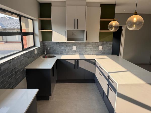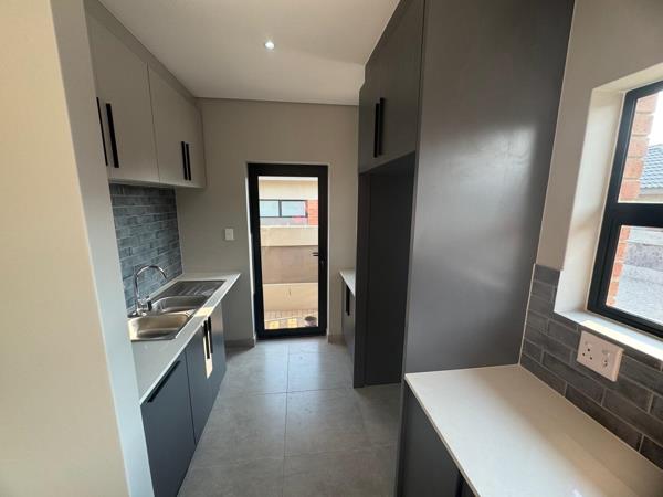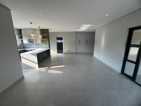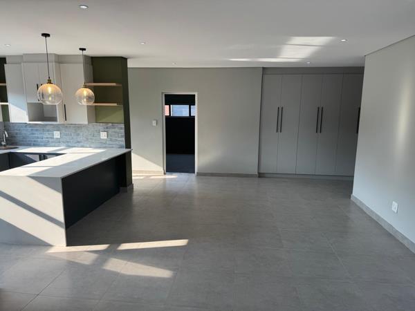 The spacious open-plan living and dining area is fully tiled, creating a clean, low-maintenance environment perfect for relaxing or entertaining. The sleek, designer kitchen comes fitted with quartz countertops, a gas hob and stove, breakfast nook, prep bowl, and a separate scullery with a dishwasher connectioncombining style with practicality for everyday living.