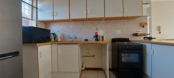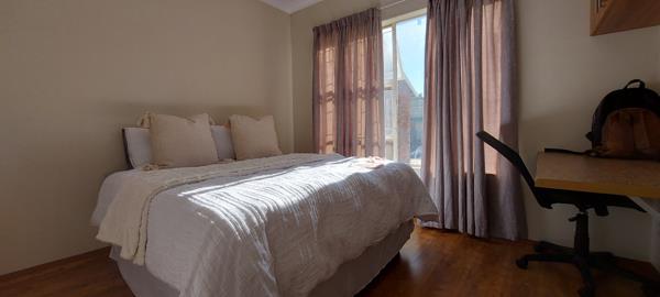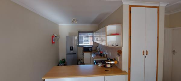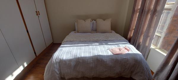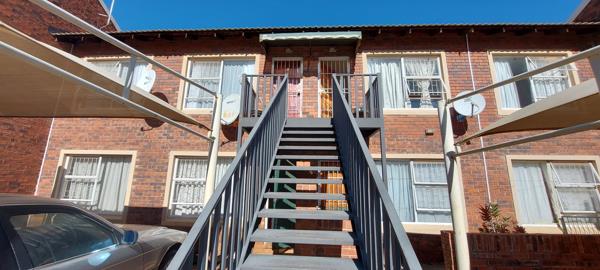 This well-maintained 2-bedroom unit on the upper level offers 1 bathroom, an open-plan lounge with laminated floors, and a kitchen with built-in cupboards, a stove, and a washing machine connection.