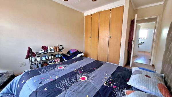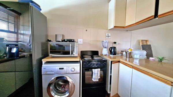 This charming first-floor unit offers a perfect blend of comfort and convenience. The spacious, open-plan living and dining area flows seamlessly, with a sliding door leading to a private balcony ideal for relaxing or entertaining. The kitchen features a practical layout with a free-standing oven and ample cupboard space, perfect for everyday cooking.