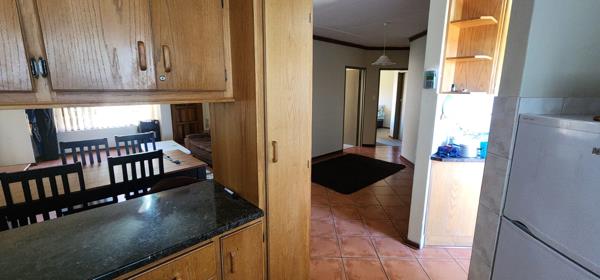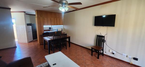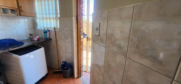 The townhouse welcomes you with a convenient front garden and a low-maintenance paved backyard with a washing line, perfect for relaxation or entertaining. Inside, the open-plan living and dining areas are tiled for easy maintenance and include a cooling fan and blinds, creating a comfortable space for family living. The adjoining kitchen features built-in cupboards, a hob, an under-counter oven, and an extractor fan, complemented by a separate scullery with a washing machine connection for added convenience.