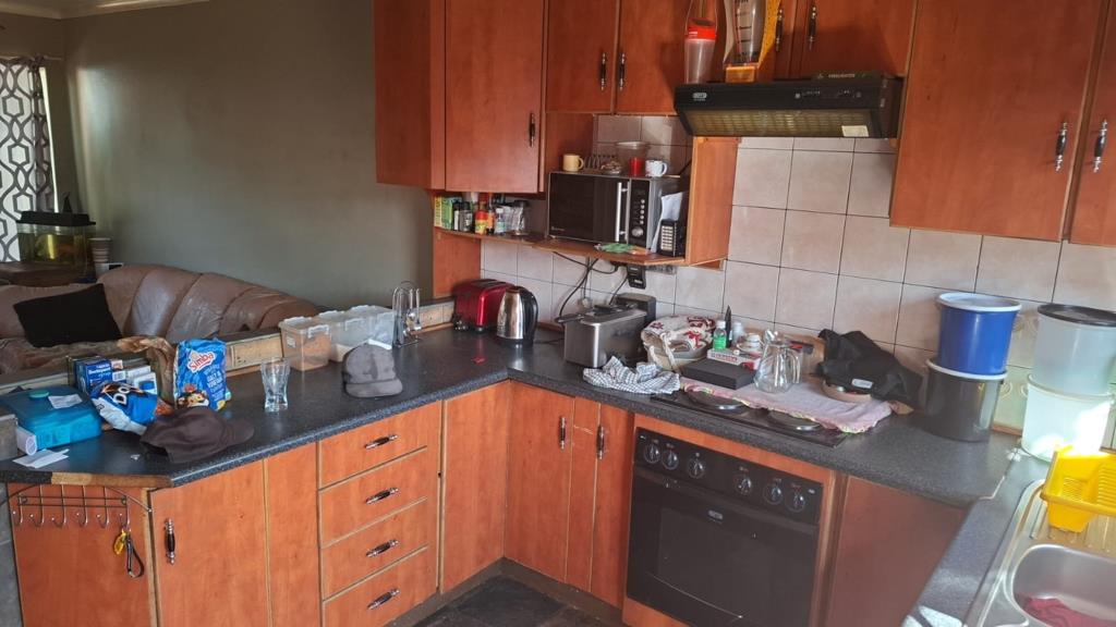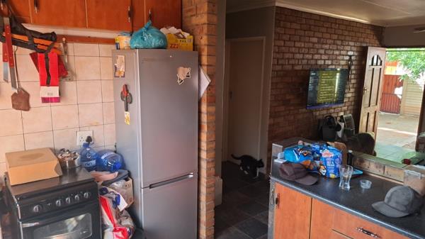 The kitchen is fitted with built-in cupboards a stove and washing machine cx.
