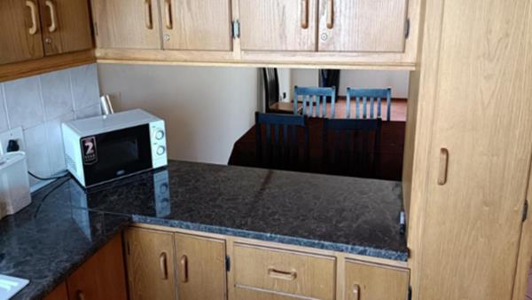 The open-plan design seamlessly integrates the dining and lounge areas, creating a welcoming space for family and entertaining. The kitchen is well-equipped with ample countertop space, generous cupboards, and a separate scullery area to keep things tidy and organized.