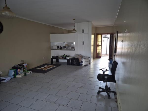 The open-plan kitchen, complete with built-in cupboards, flows seamlessly into the lounge area, which is bright and inviting. A sliding door leads to a small garden or braai area, ideal for outdoor relaxation and entertaining.