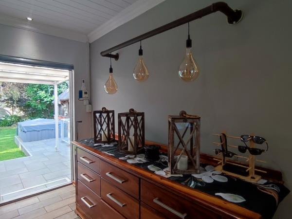 Through the dining area, you step outside to the private oasis, featuring the solar heated splash pool surrounded with glass, a jacuzzi with the magnificent lapa braai room for whole year gatherings and entertainment plus lots of covered and secure parking space.